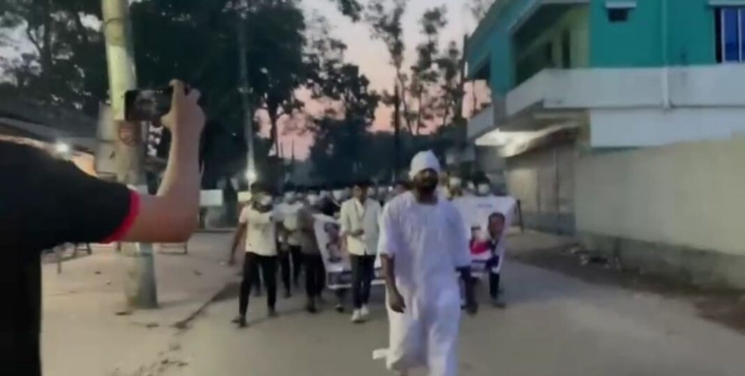 পটুয়াখালীর দশমিনা উপজেলায় ছাত্রলীগের এক নেতার নেতৃত্বে কাফনের কাপড় জড়িয়ে মিছিল অনুষ্ঠিত হয়েছে। রোববার (৯ নভেম্বর) ভোরে উপজেলা প্রাণিসম্পদ অফিসের সামনে থেকে শুরু হয়ে মিছিলটি আদালত এলাকায় গিয়ে শেষ হয়।