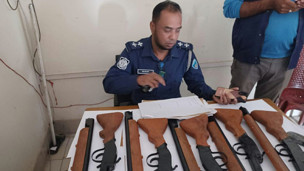 ব্যাগটি খুলে দেখা যায় ভেতরে রয়েছে ৬টি দেশীয় তৈরি একনলা বন্দুক এবং ১টি দেশীয় তৈরি পাইপগান।