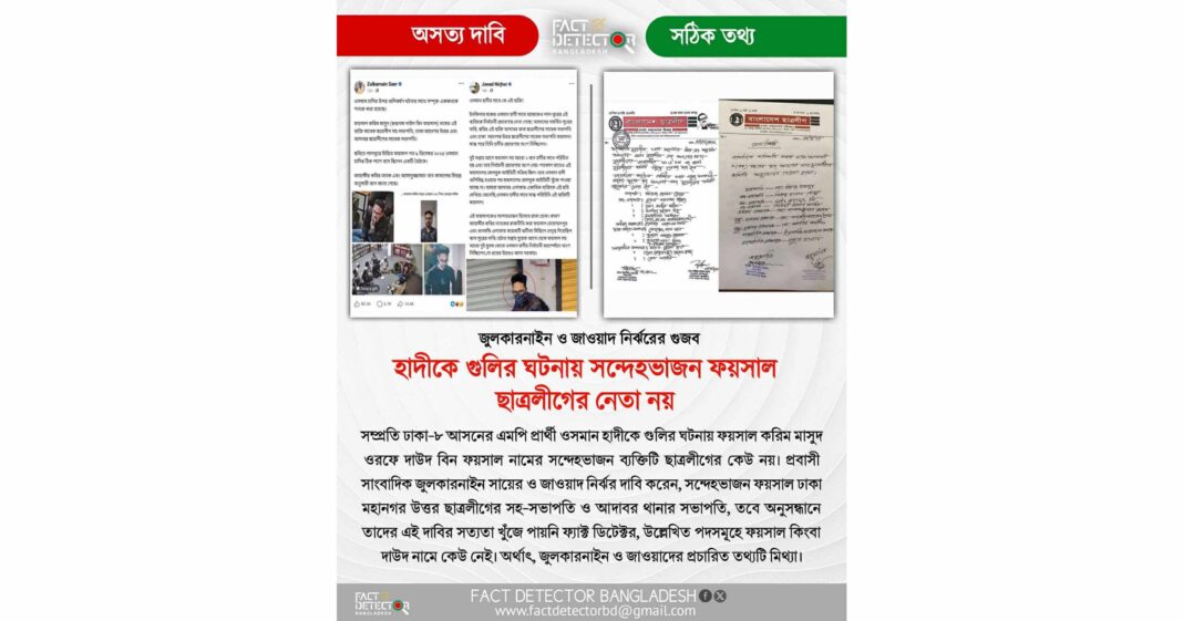 ঢাকা-৮ আসনের এমপি প্রার্থী ওসমান হাদিকে গুলির ঘটনায় সন্দেহভাজন ফয়সাল করিম মাসুদ ওরফে দাউদ করিম ফয়সাল ছাত্রলীগের কেউ নন। প্রবাসী সাংবাদিক জুলকারনাইন সায়ের ও জাওয়াদ নির্ঝর দাবি করেছিলেন, ফয়সাল ঢাকা মহানগর উত্তর ছাত্রলীগের সহ-সভাপতি ও আদাবর থানার সভাপতি। তবে ফ্যাক্ট ডিটেক্টরের অনুসন্ধানে এসব দাবির কোনো সত্যতা পাওয়া যায়নি। সংশ্লিষ্ট পদগুলোতে ফয়সাল বা দাউদ নামে কারও অস্তিত্ব নেই। ফলে জুলকারনাইন ও জাওয়াদের প্রচারিত তথ্যকে মিথ্যা ও বিভ্রান্তিকর বলে উল্লেখ করেছে ফ্যাক্ট ডিটেক্টর বাংলাদেশ।
