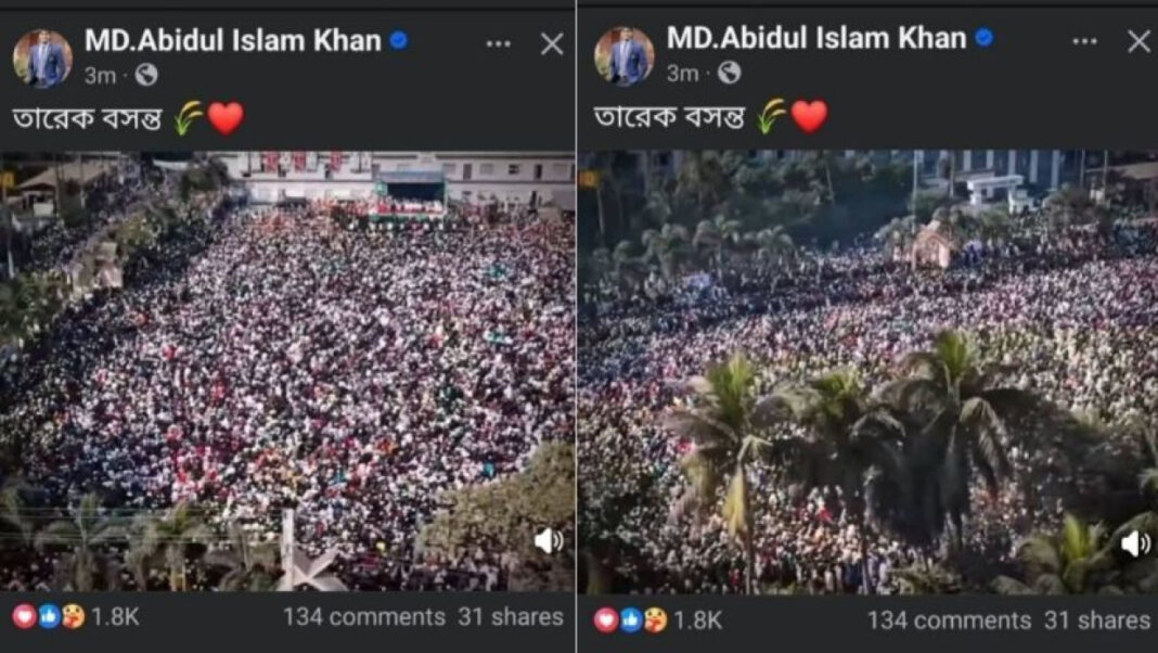 বিএনপির প্রতি জনসমর্থনের ইঙ্গিত দিতে সামাজিক যোগাযোগমাধ্যমে জামায়াতের একটি সমাবেশের ভিডিও পোস্ট করেছেন ঢাকা বিশ্ববিদ্যালয় ছাত্রদলের নেতা আবিদুল ইসলাম খান। সোমবার রাতে নিজের ভেরিফায়েড ফেসবুক আইডিতে তিনি ভিডিওটি শেয়ার করেন, যেখানে ক্যাপশনে লেখা ছিল ‘তারেক বসন্ত’।