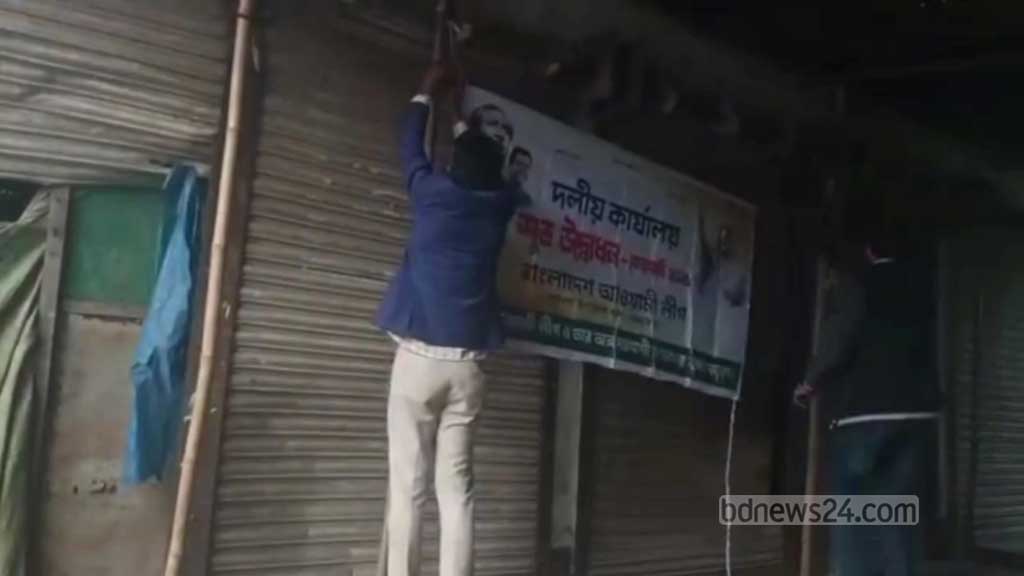 কার্যক্রম স্থগিত থাকা আওয়ামী লীগের নেত্রকোণার পূর্বধলা উপজেলা কার্যালয়ের সামনে ‘শুভ উদ্বোধন’ লেখা একটি ব্যানার টানানো হয়েছে এমন একটি ভিডিও রোববার দুপুরে সামাজিক যোগাযোগমাধ্যমে ছড়িয়ে পড়ে।