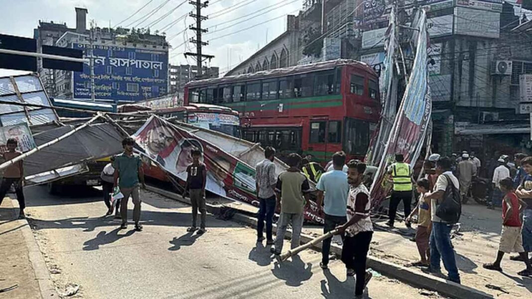 প্রত্যক্ষদর্শীরা জানান, চার লেনবিশিষ্ট সড়কের মাঝখানে বাঁশ ও কাঠ দিয়ে তোরণটি নির্মাণ করা হয়েছিল। হঠাৎ সেটি ভেঙে পড়ে সড়কজুড়ে ছড়িয়ে পড়ে।